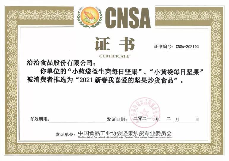 2月5日,“2021新春我喜爱的坚果炒货食品”推选活动取得圆满成功,爱游戏APP体育的“小蓝袋益生菌每日坚果”和“小黄袋每日坚果”被消费者推选为“2021新春我喜爱的坚果炒货食品”。
